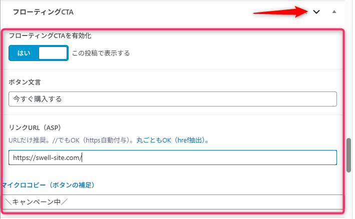 - フローチングCTAの有効化:クリックして「はい」で表示。「いいえ」で非表示